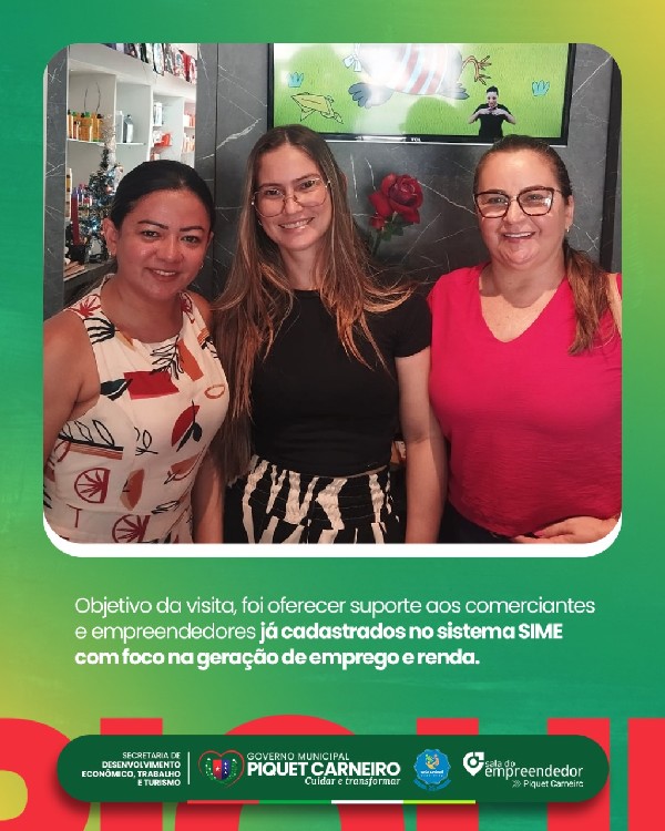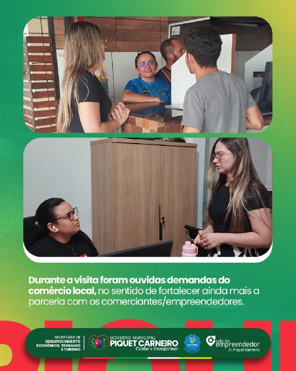 Na manhã desta quarta-feira (19), a equipe da Sala do Empreendedor e do SIME - Sistema Municipal de Emprego, realizaram visitas aos estabelecimentos comerciais de Piquet Carneiro, com o objetivo de ouvir as demandas e fortalecer ainda mais a parceria com comerciantes/empreendedores.