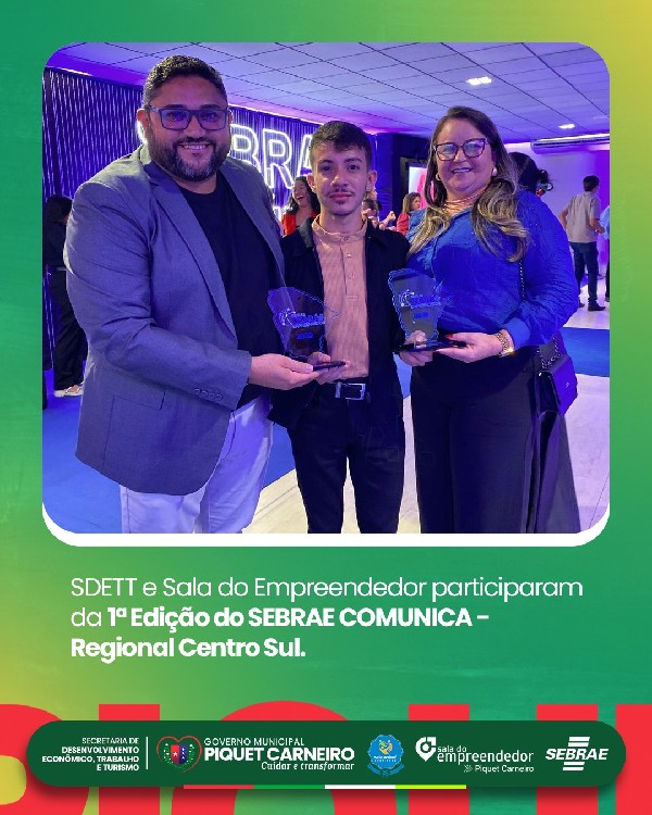A Secretaria de Desenvolvimento Econômico, Trabalho e Turismo (SDETT), junto à Sala do Empreendedor, participaram da 1ª Edição do SEBRAE Comunica - Regional Centro Sul, um encontro que reuniu municípios parceiros para fortalecer conexões, apresentar resultados e celebrar avanços no desenvolvimento regional.