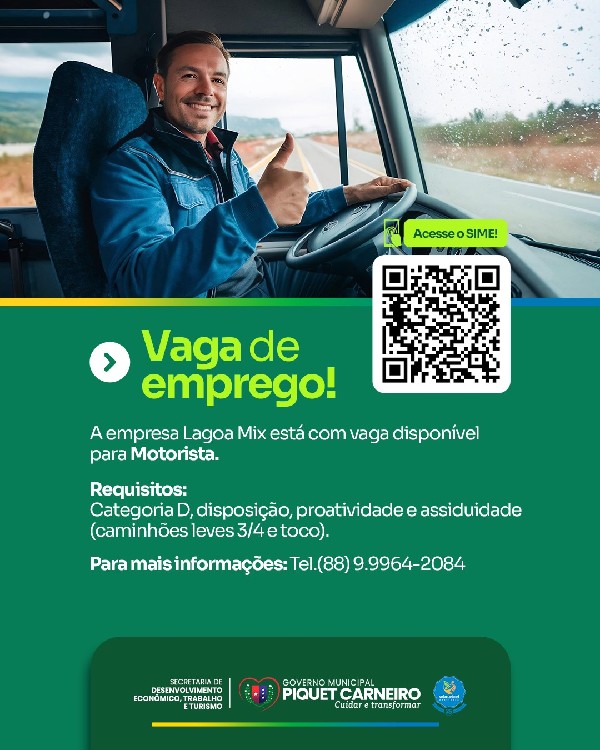 A Secretaria de Desenvolvimento Econômico, Trabalho e Turismo (SDETT), por meio da Coordenação do Trabalho e SIME, COMUNICA que a Empresa Lagoa Mix está com vaga disponível para: Motorista.