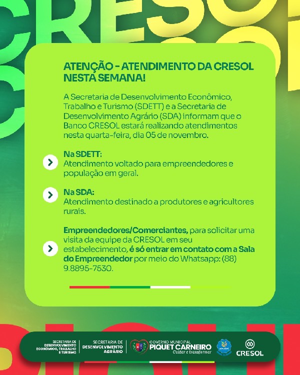 E atenção Empreendedores/Comerciantes, para solicitar uma visita da equipe da CRESOL em seu estabelecimento, é só entrar em contato com a Sala do Empreendedor por meio do Whatsapp: (88) 9.8895-7530.
