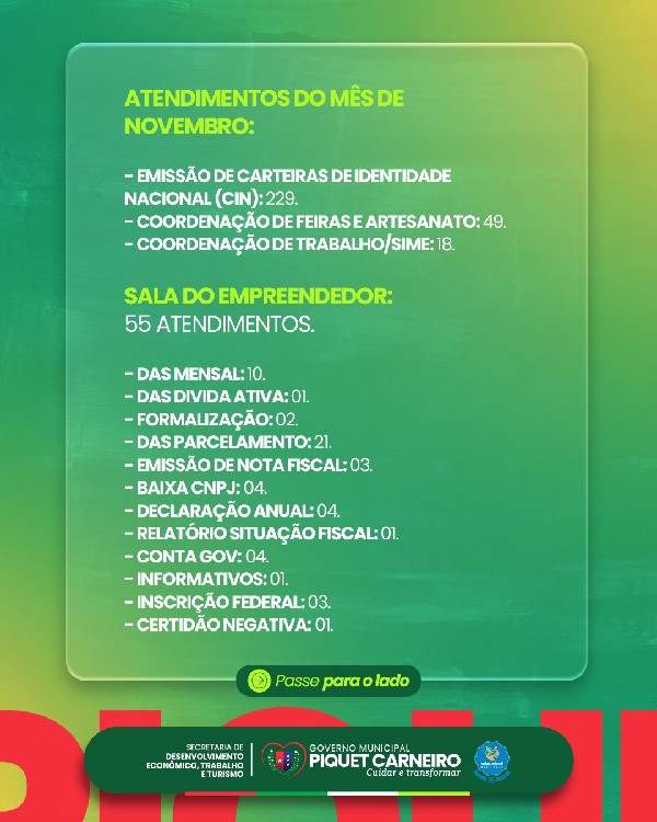 A Secretaria de Desenvolvimento Econômico, Trabalho e Turismo (SDETT) apresenta o balanço das ações realizadas ao longo do mês de novembro, destacando o compromisso com o atendimento ao cidadão, o incentivo ao empreendedorismo e o fortalecimento das atividades econômicas do município.