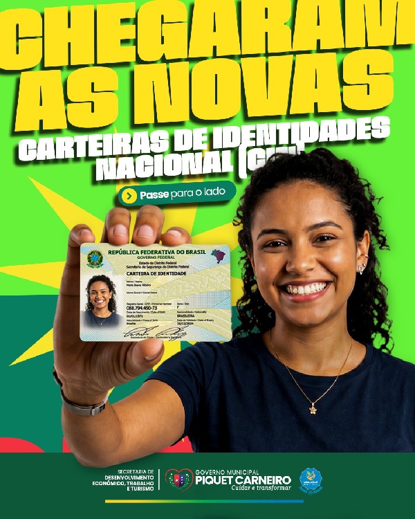 A Secretaria de Desenvolvimento Econômico, Trabalho e Turismo (SDETT), através do NÚCLEO DE IDENTIFICAÇÃO, COMUNICA que chegaram mais uma nova remessa das Carteiras de Identidade Nacional (CIN).