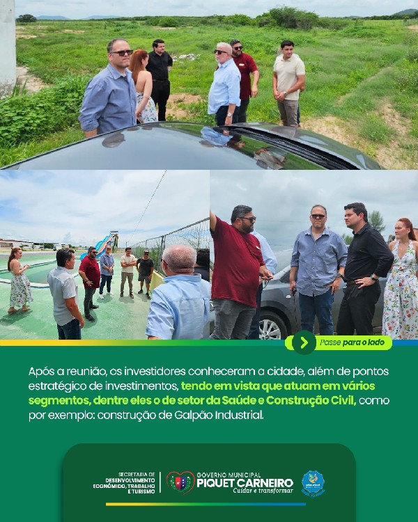 Após o encontro, os investidores conheceram a cidade e visitaram pontos estratégicos para futuros empreendimentos, tendo em vista que atuam em vários segmentos, dentre eles o setor da Saúde e Construção Civil, como por exemplo: construção de Galpão Industrial.