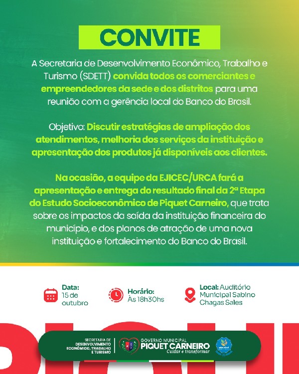 A Secretaria de Desenvolvimento Econômico, Trabalho e Turismo (SDETT) convida todos os comerciantes e empreendedores da sede e dos distritos para uma reunião com a gerência local do Banco do Brasil.