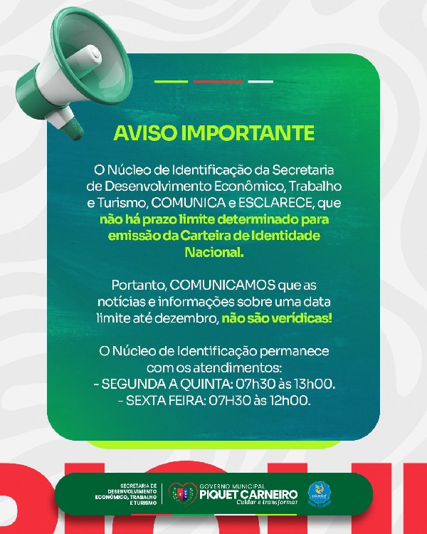 #cidadania #nucleodeidentificação #carteiradeidentificaçãonacional #aviso #Sdett #PiquetCarneiro