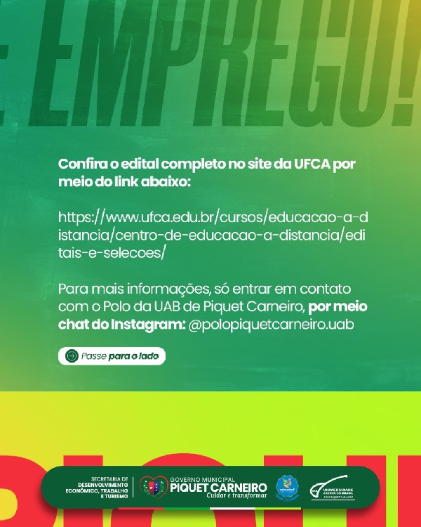 Para mais informações, só entrar em contato com o Polo da UAB de Piquet Carneiro, por meio do chat do Instagram: @polopiquetcarneiro.uab.
