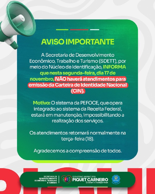 A Secretaria de Desenvolvimento Econômico, Trabalho e Turismo (SDETT), por meio do Núcleo de Identificação, INFORMA que nesta segunda-feira, dia 17 de novembro, NÃO haverá atendimentos para emissão da Carteira de Identidade Nacional (CIN).