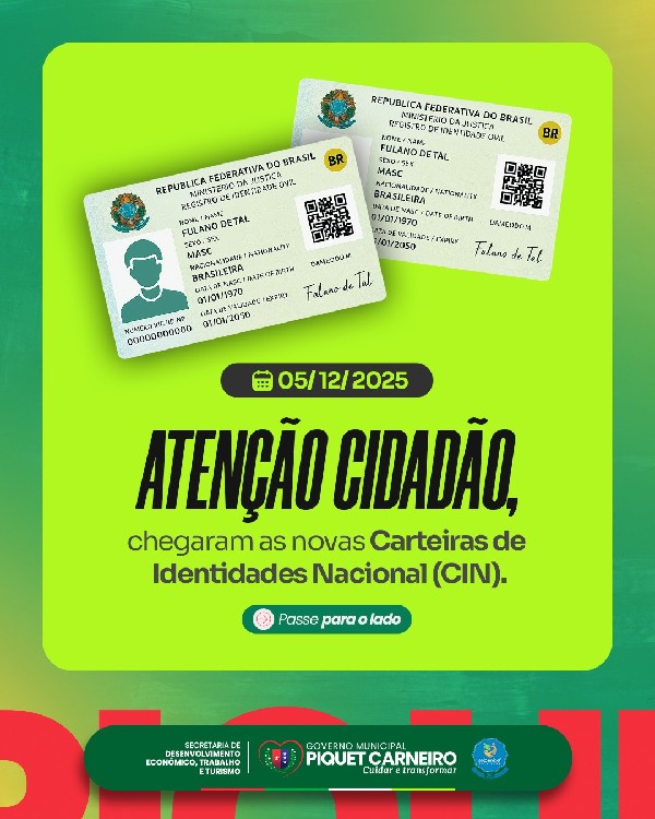 ATENÇÃO CIDADÃO - A Secretaria de Desenvolvimento Econômico, Trabalho e Turismo (SDETT), através do NÚCLEO DE IDENTIFICAÇÃO, COMUNICA que chegaram uma nova remessa das Carteiras de Identidade Nacional (CIN) da última semana.