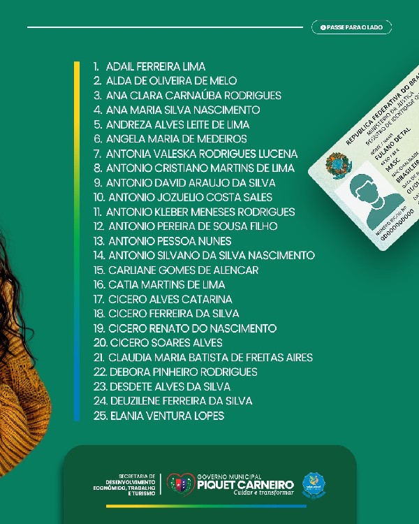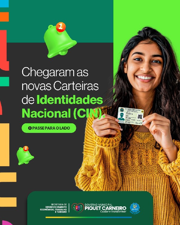 A Secretaria de Desenvolvimento Econômico, Trabalho e Turismo (SDETT), através do NÚCLEO DE IDENTIFICAÇÃO, COMUNICA que chegaram mais uma nova remessa das Carteiras de Identidade Nacional (CIN).