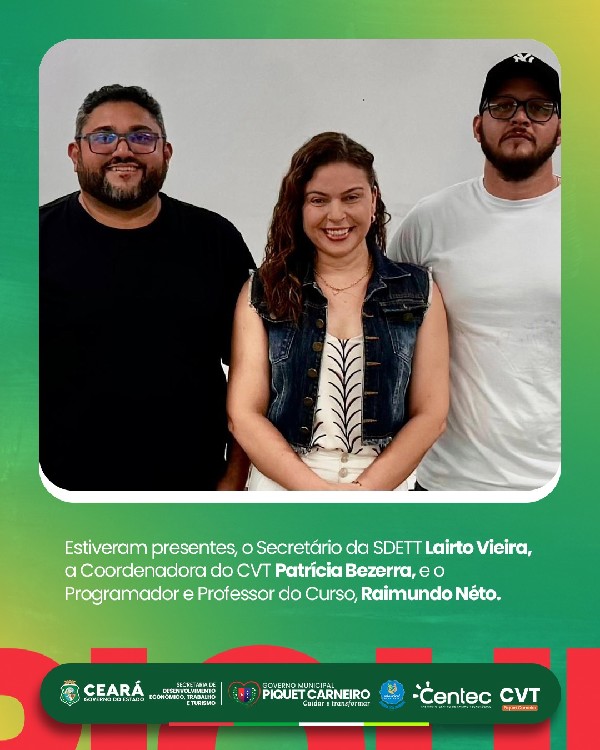 Estiveram presentes, o Secretário Lairto Vieira, a Coordenadora do CVT Patrícia Bezerra, e o Programador e Professor do Curso, Raimundo Néto.