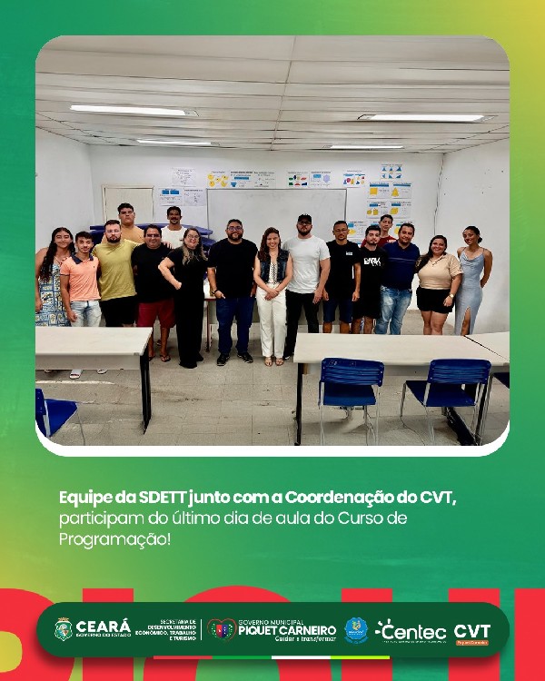 Às aulas teóricas e práticas foram concluídas, mas a turma ainda terá outro momento para ampliar ainda mais os conhecimentos, onde no próximo dia 22/12, estarão realizando uma visita guiada na sede de duas (02) empresas de Tecnologia na Capital Fortaleza. Uma visita planejada e alinhada da SDETT com a Coordenação do CVT e com o apoio da Gestão Municipal.