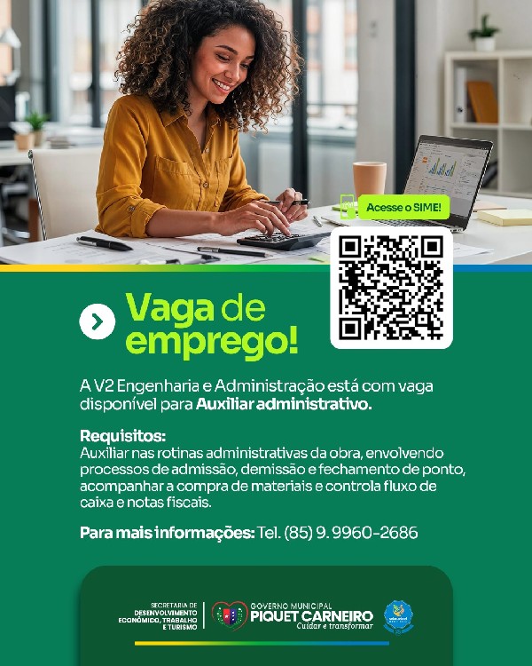 A Secretaria de Desenvolvimento Econômico, Trabalho e Turismo (SDETT), por meio da Coordenação do Trabalho e SIME, COMUNICA que a empresa V2 Engenharia e Administração está com vaga disponível para: Auxiliar Administrativo.