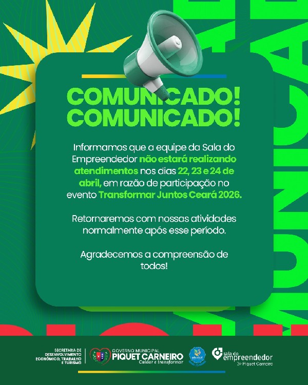 A Sala do Empreendedor de Piquet Carneiro, COMUNICA que não estará realizando atendimentos nos dias 22, 23 e 24 de abril, em decorrência da participação dos Agentes no evento Tranformar Juntos Ceará - SEBRAE 2026.